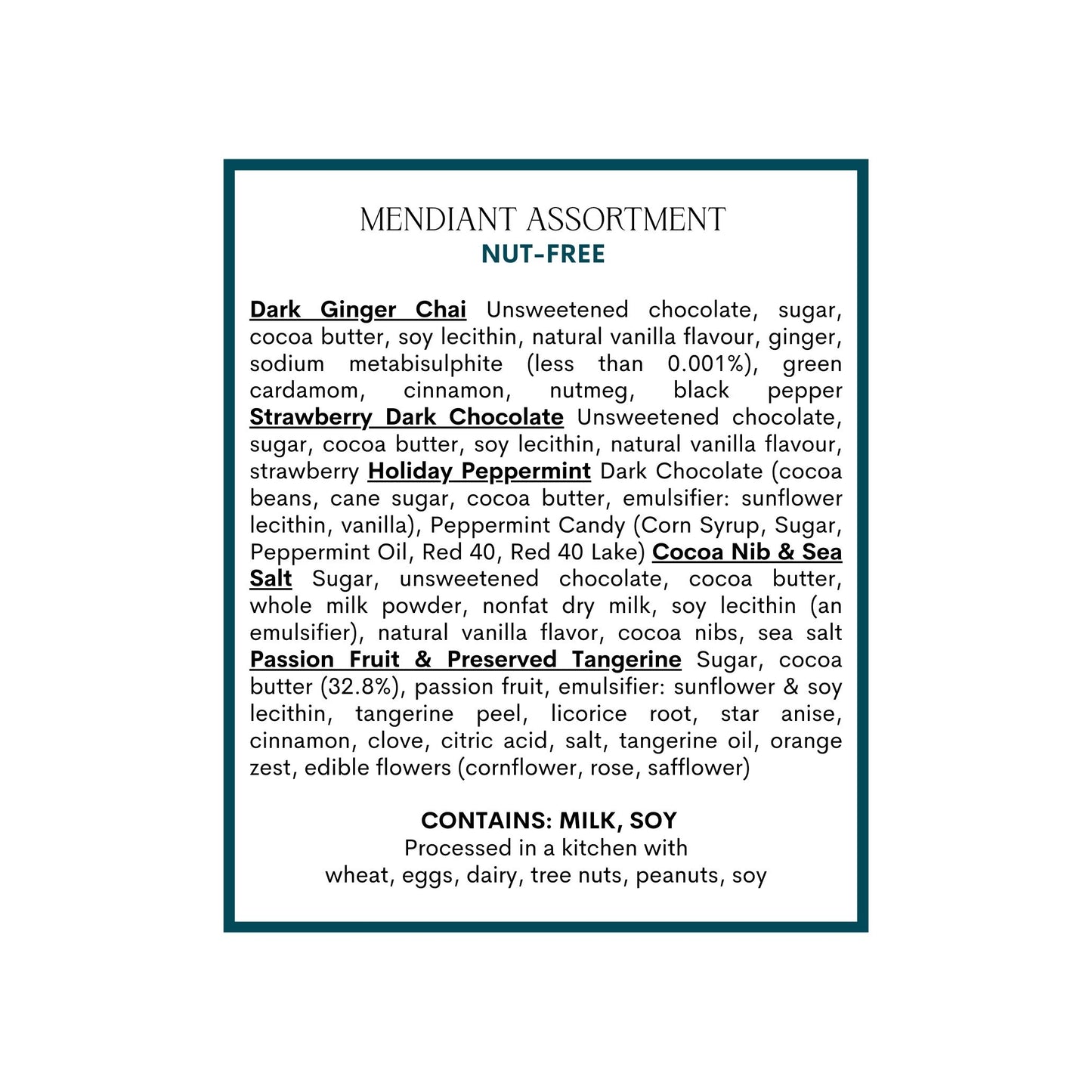 Nut-Free: dark ginger chai - strawberry dark chocolate - holiday peppermint - passion fruit & preserved tangerine - cocoa nib & sea salt